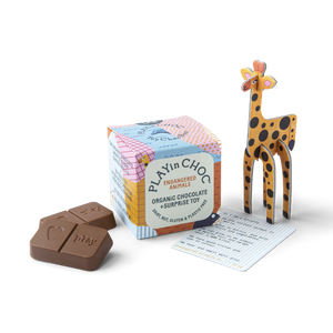 Each PLAYin CHOC® ToyChoc Box® contains two individually wrapped, deliciously creamy, organic, dairy-free chocolates, a 3D cardboard puzzle toy to assemble and a fun facts card.